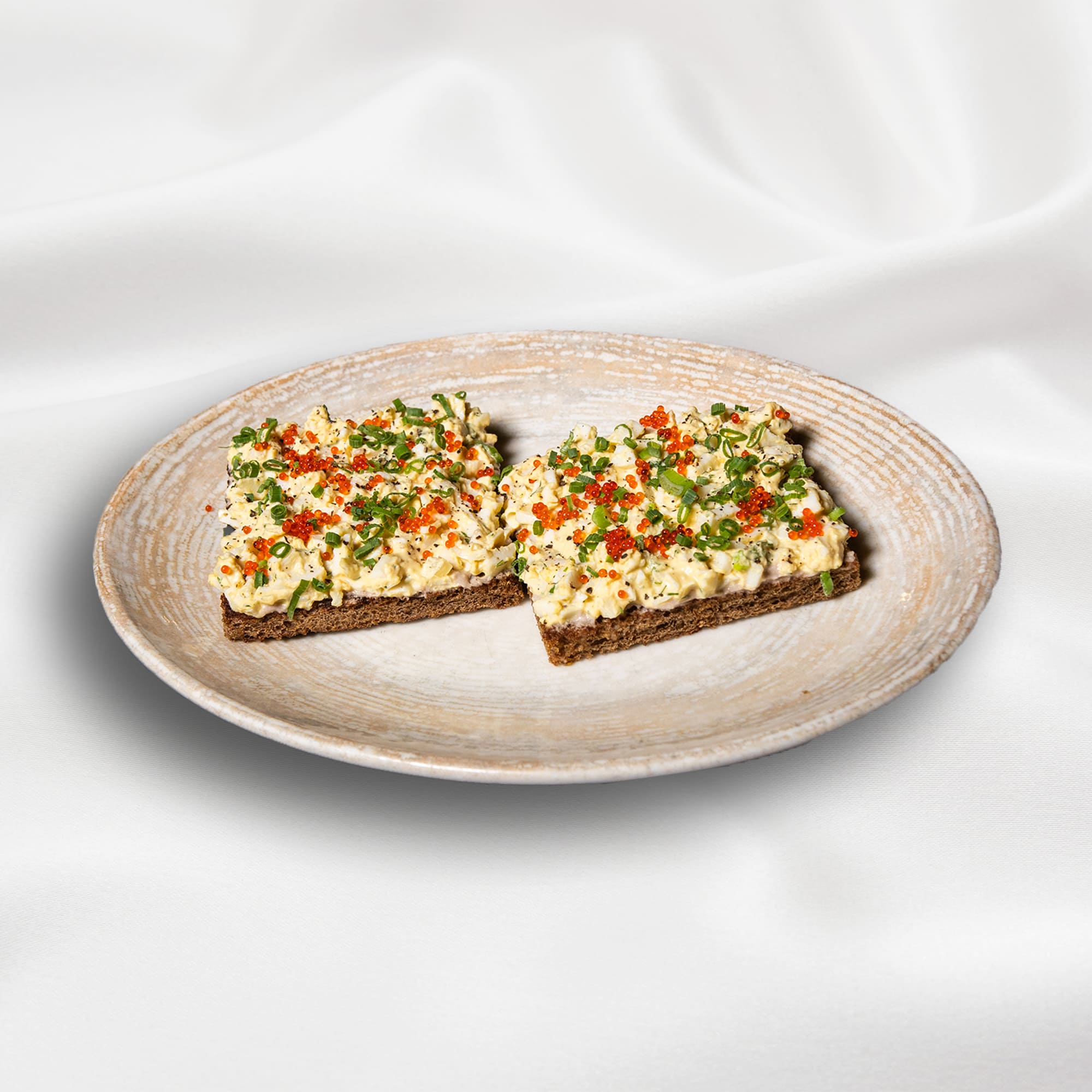 Bruschetta with cod liver, egg salad and tobiko caviar