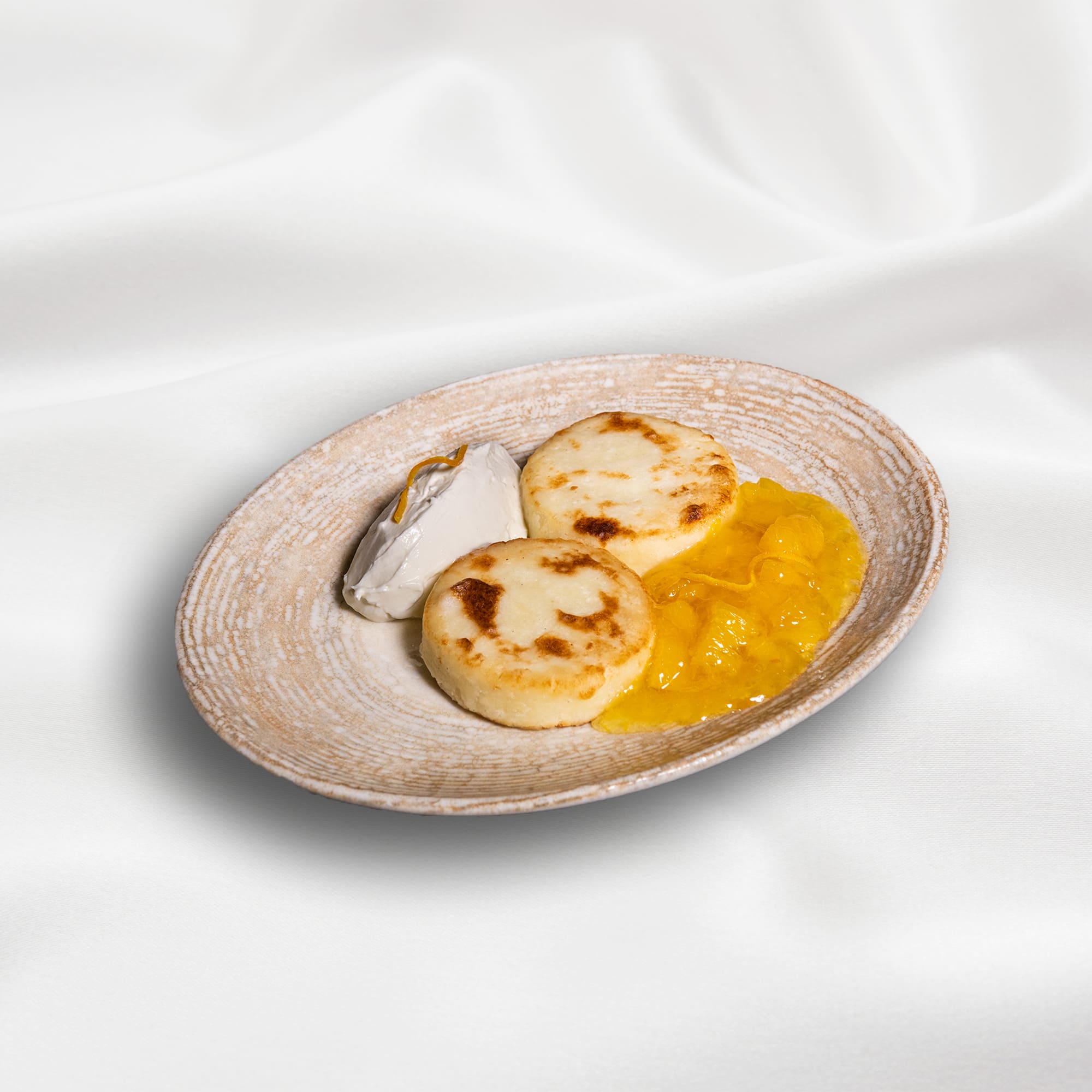 Cottage cheese pancakes with orange confiture and mascarpone cream